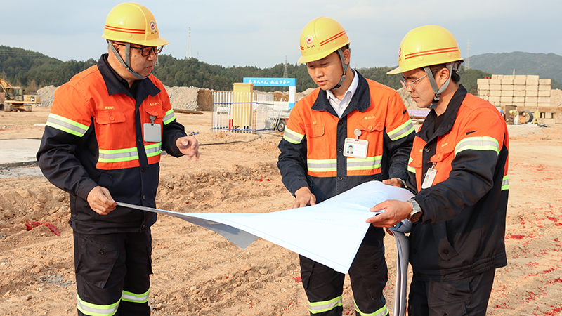 ◐ 冉懋超(中)在金属锂项目现场查看施工进度