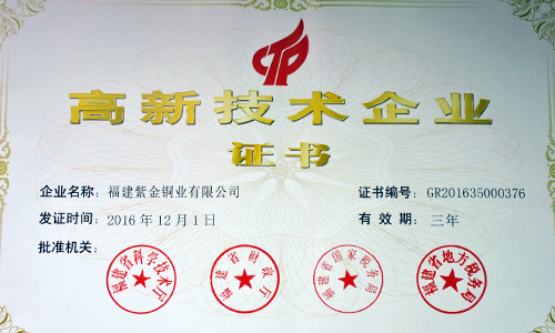近日,据福建省科技厅、财政厅、国税局、地税局联合发文(闽科高[2016]22号),福建紫金铜业被认定为2016年高新技术企业。