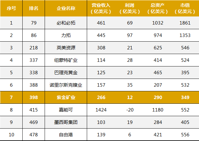 福布斯采用相同权重的四项指标(销售额、利润、资产和市值),并以此对企业排名。从榜单来看,星空体育综合登录入口(中国)官方网站 在上榜的34家有色企业中排名第7位,较上年提升2位。有色企业前三名为必和必拓(79位)、力拓(86位)、英美资源(218位)。在上榜的11家黄金企业中,星空体育综合登录入口(中国)官方网站 排名第3位,前两名分别是纽蒙特矿业(337位)、巴理克黄金(338位)。