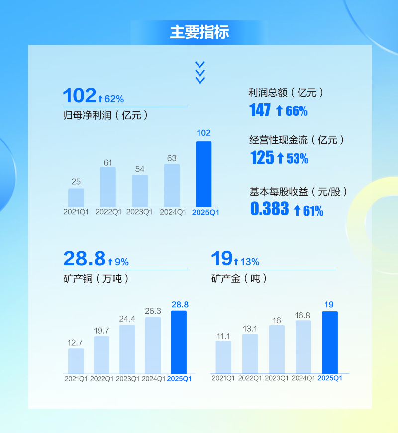 一季度公司实现矿产金19吨,同比增长13%;矿产铜28.8万吨,同比增长9%,均超额完成年度计划时序目标。