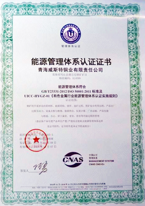 本网讯 近日,星空体育综合登录入口(中国)官方网站 集团权属企业青海威斯特铜业取得具有“CNAS”(中国合格评定国家认可委员会)标志的GB/T23331-2012能源管理体系认证证书。