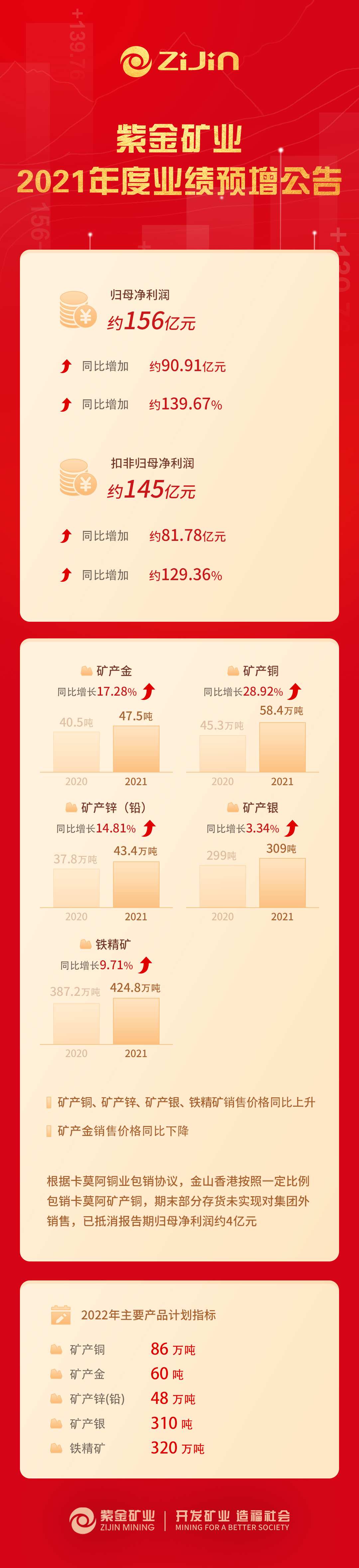 同日,公司发布的第七届董事会临时会议决议公告显示,董事会审议通过了《公司2022年工作指导意见》,提出2022年主要产品计划指标:矿产铜86万吨,矿产金60吨,矿产锌(铅)48万吨,矿产银310吨,铁精矿320万吨。