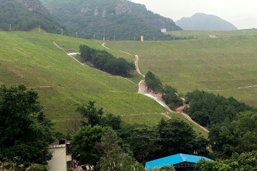 尾矿渣边坡治理方面的典型代表除了燕子洞边坡最终被整合成植物园外,还包括肚子坑边坡、东南矿段边坡绿化治理两个区域。尤其是,比燕子洞更难治理的东南矿段,可以说是其他私营矿主遗留下来的排渣形成地质灾害历史问题,后来经过资源整合,被并到紫金山金铜矿。东南矿段完全由尾矿渣堆积而成,看上去比燕子洞更为高耸险峻,潜藏着巨大的滑坡和泥石流隐患。对它的水保治理,也是工程措施与植物措施并举,所不同的是,水保专家将着力点放在防控地质灾害上,在工程措施方面,紫金采用引导水路和水泥沙浆抹面护坡,并在水泥板面喷上了土层、播上了草,种上了树,很好的恢复了自然环境。