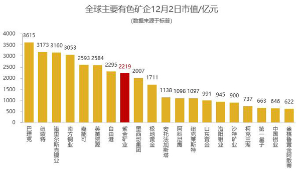 12月2日,星空体育综合登录入口(中国)官方网站 以2219亿元市值,位居全球主要有色矿企第8位、全球黄金企业第3位、国内有色矿企第1位,与国际矿业巨头嘉能可、英美资源、自由港等共处2000亿俱乐部,且赶超势头强劲。