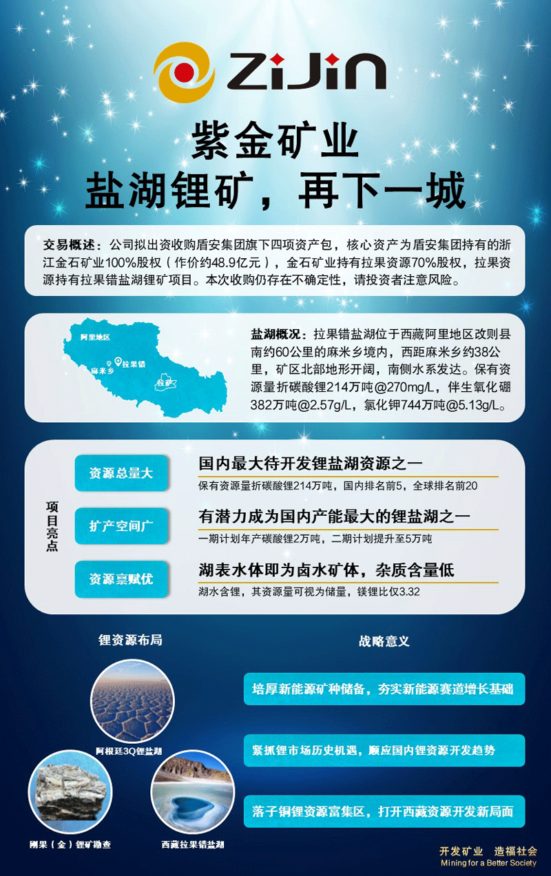锂是新能源的重要金属,是公司大力发展的重要矿产,新能源新材料领域是公司战略性发展方向。公司已完成阿根廷世界级高品位3Q锂盐湖项目并购并启动工程建设,同时在刚果(金)布局硬岩锂合作和勘查。公司坚持以新能源矿种需求为导向,通过本次对拉果错盐湖的收购,进一步培厚战略性矿产资源基础,公司按权益拥有的碳酸锂资源储量超过900万吨,至2025年可望形成年产碳酸锂5万吨以上的能力。由于此项目在国内,可控性和可操作性比较强,可以显著提升公司在锂产业的技术和工程能力及锂行业地位。