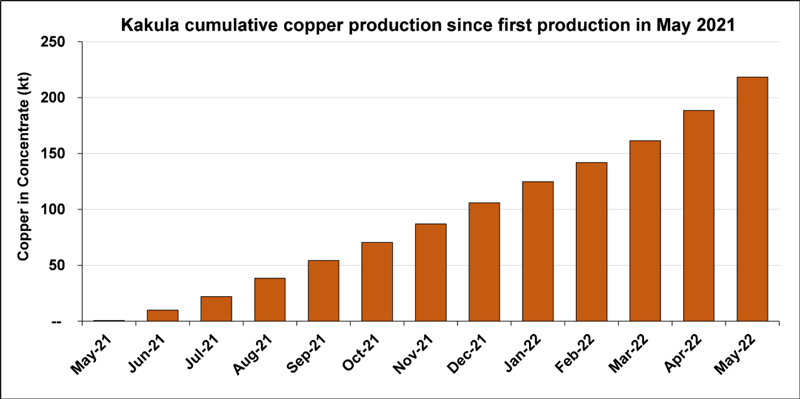 5月份,卡莫阿铜矿一、二期选厂共处理66万吨矿石(年化总处理量约800万吨),生产精矿含铜金属2.98万吨,创下全新月度纪录。项目今年1-5月共生产精矿含铜金属约11.26万吨,预计今年上半年产铜14.52万吨;随着二期选厂产能持续爬坡,总处理能力仍有进一步提升空间,预计2022年全年产铜量达到生产指导目标上限34万吨。