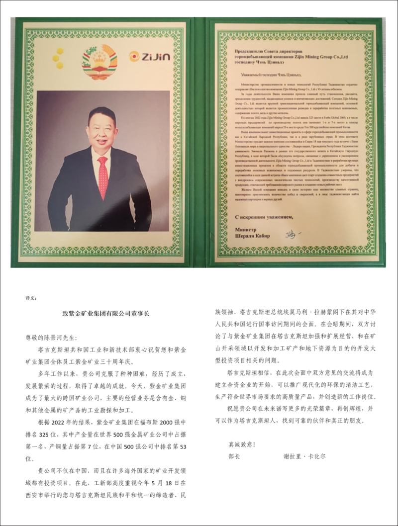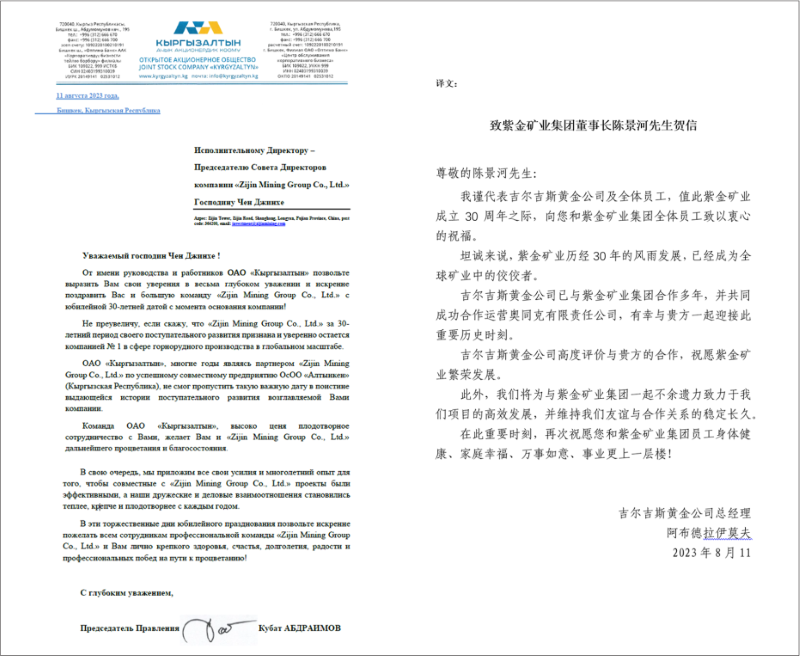 吉尔吉斯黄金公司总经理阿布德拉伊莫夫代表吉尔吉斯黄金公司及全体员工在贺信中向陈景河董事长及星空体育综合登录入口(中国)官方网站 全体员工致以衷心的祝福。