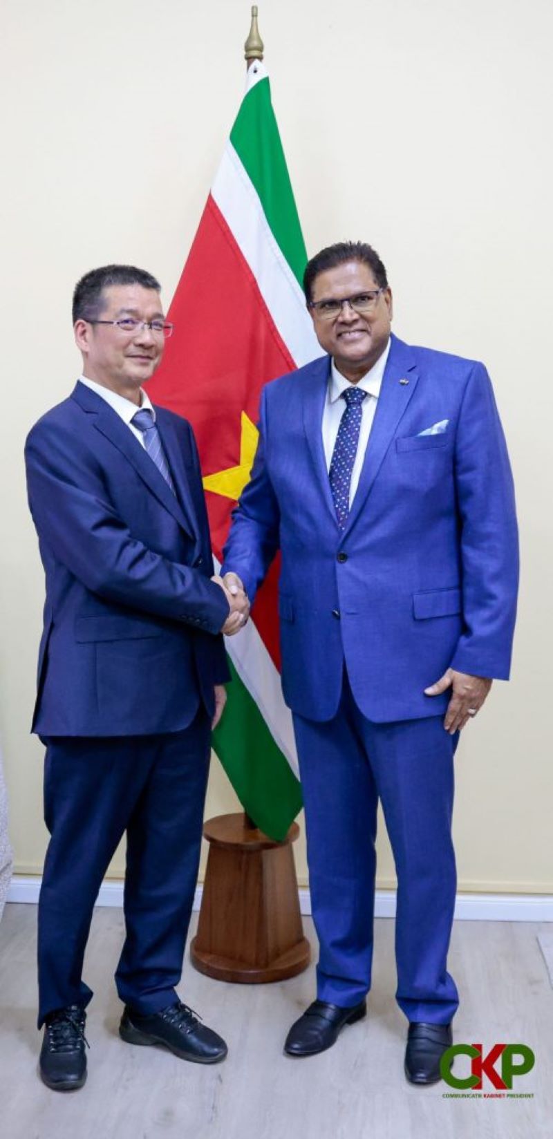 当天,中国驻苏里南大使韩镜还与邹来昌总裁举行了会谈。