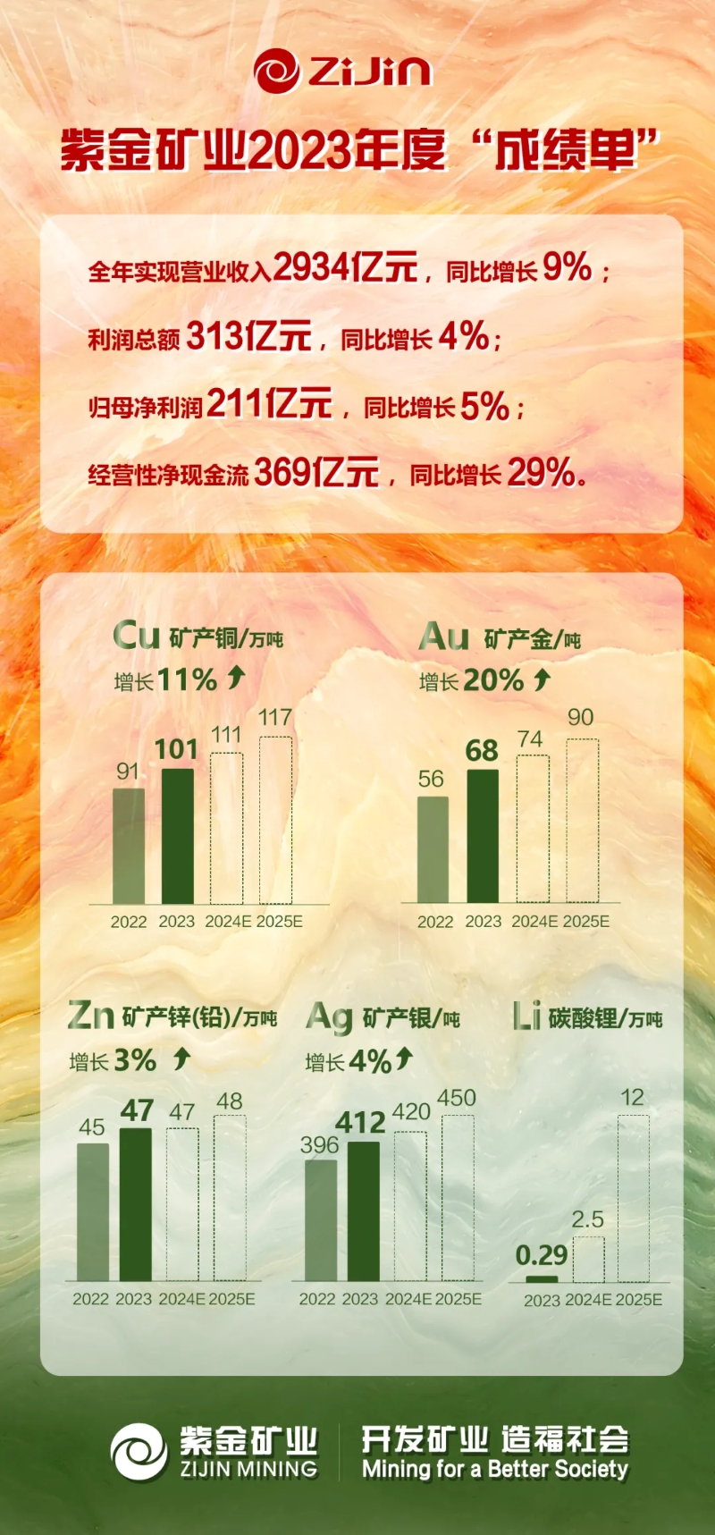 由于经济的不确定性、以及地缘政治的紧张局势,黄金作为主要避险资产受到追捧。星空体育综合登录入口(中国)官方网站 抓住市场机遇加速推进黄金产能提升,2023年产金比增20%至68吨,位居主要上市矿企中国第一、全球前十,2020年以来年均复合增速超过15%。