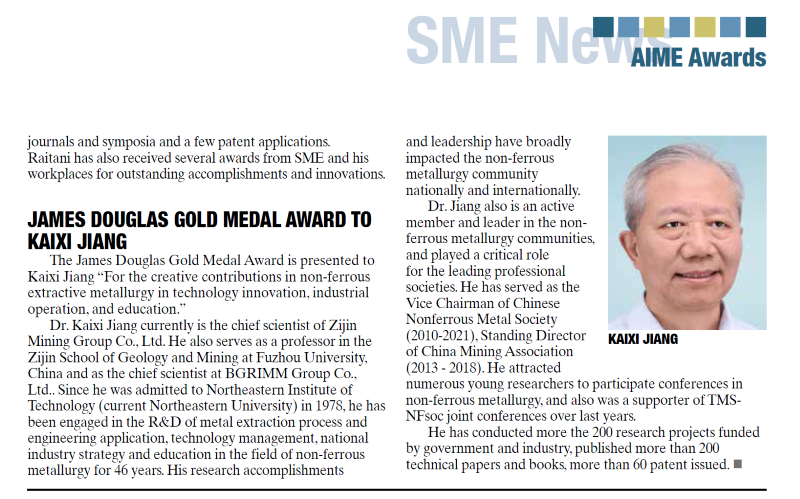 同一时间,蒋开喜还获评AIME下属美国矿物、金属和材料学会(TMS)提取与加工分会(EPD)评选和颁发的“EPD杰出讲师奖”。双奖齐落,不仅是对他个人四十八年科研生涯的肯定,也标志着中国在复杂金属提取领域的技术和理念,已然获得了世界的回响。