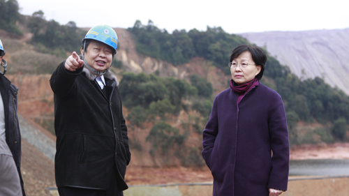 调研组一行深入生产一线,先后在旅游接待中心、露采观景台、415反坝、铜矿湿法厂溶液控制中心、铜矿湿法厂选冶车间等开展实地考察。