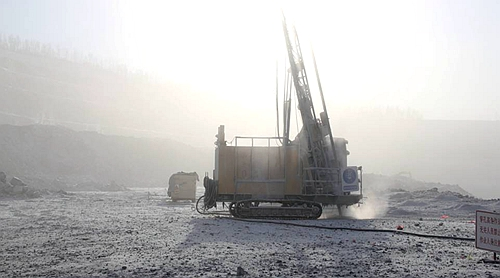 零下四十度环境中钻机正在工作,采坑内雾气弥漫