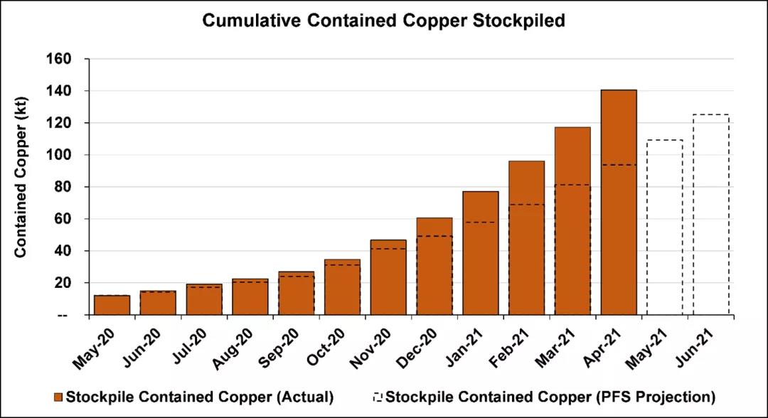 卡莫阿-卡库拉铜矿4月份再创月度开拓记录,累计完成约42.2公里,项目投产前地表堆场已储备了约300万吨高品位和中品位矿石,平均铜品位约4.74%,铜金属量超过14万吨。