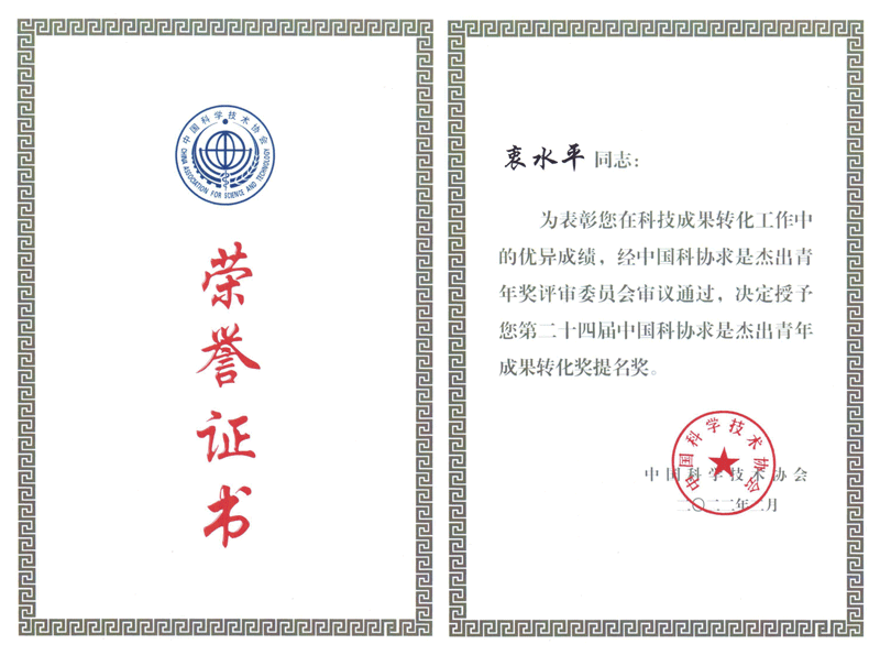 本网讯 近日,星空体育综合登录入口(中国)官方网站 衷水平博士荣获第二十四届中国科协“求是杰出青年成果转化奖”提名奖。该奖项鼓励青年科技人才在成果转化、科技经济融合工作中建功立业,全国仅10人获成果转化奖,10人获成果转化奖提名奖。